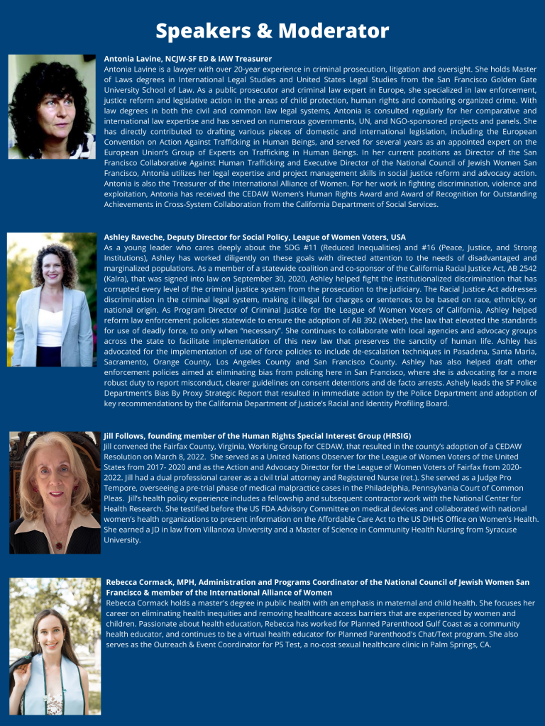 Join us for a session of storytelling and discussion about women’s achievements and challenges in pushing back against deeply ingrained societal norms, misinformation, and deflection. Our three short plays showcase women’s influence in the drafting of the 1948 Universal Declaration of Human Rights, the creation of the 1979 Convention on the Elimination of All Forms of Discrimination Against Women, and the present-day resurgence in securing city and county-wide resolutions in support of CEDAW.