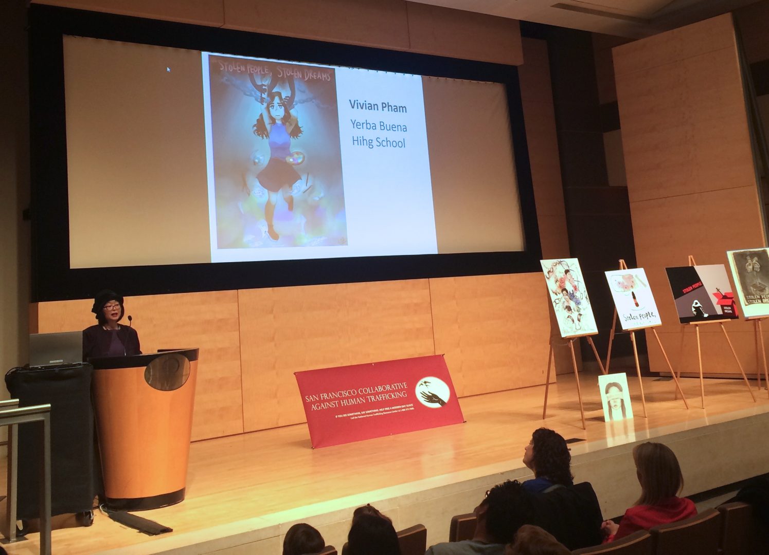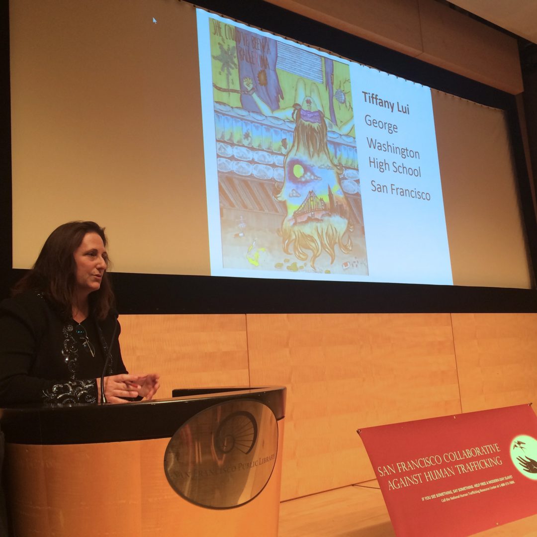 Joined by parents, teachers and community members, youth from across the Bay Area gathered to perform and share experiences in anti-trafficking advocacy and prevention. Supervisor Katy Tang presented the awards to the winners of the SFCAHT 2017 Teen Poster and Writing Contest. Master of Ceremonies was Human Rights Documentary Filmmaker Sheri Shuster. Dr. Emily Murase, SF Board of Education Member and ED of the SF Department on the Status of Women and victim rights attorney Rose Mukhar, Chair of the SFCAHT Teen Poster and Writing Committee, addressed the audience. SFCAHT Chair Marianna Warmee presented the closing remarks.