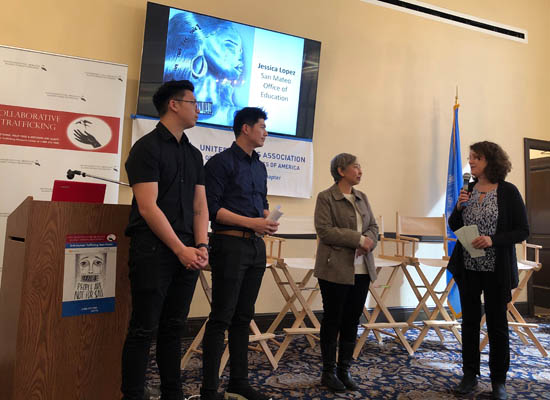 On February 29, 2020, at the closing event of the SFCAHT’s 2020 Awareness Campaign in the San Francisco War Memorial Veterans Building, we presented two awards of the 2020 “Nancy Surkin Memorial Scholarship for Survivors of Human Trafficking” to Andreas Jeremy and Kenneth Nathaniel, youth survivors of labor trafficking, clients of Asian Women Shelter. The scholarship awards were presented by NCJW San Francisco Vice President, Teddi Silverman. We are grateful to Debra and Janet Surkin for their generous donations to establish and support this scholarship!